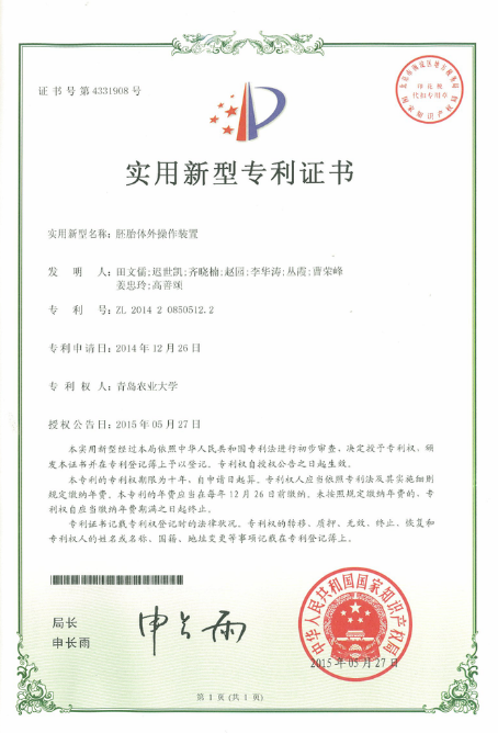 2. 专利:胚胎体外操作装置。田文儒,迟世凯,齐晓楠,赵园,李华涛,丛霞,曹荣峰,姜忠玲,高善颂;实用新型;专利号:ZL 201420850512.2;