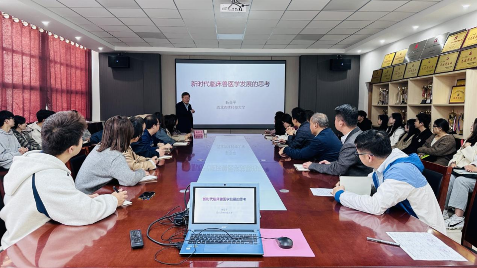 靳亚平教授以《新时代临床兽医学发展的思考》为题,凭借丰富的学识和实践经验,运用生动的案例,将复杂的学术理论转化为通俗易懂的知识,为师生们全面阐述了新时代临床兽医学发展的相关内容。靳亚平指出,当今是推进强国建设、民族复兴伟业的关键时期,种业是农业的“芯片”,他详细分析了当前临床兽医学面临的形势、机遇与挑战,强调了临床兽医学在保障动物健康、维护公共卫生安全以及促进畜牧业发展等方面的重要性。同时,靳亚平教授还就临床兽医学的技术创新、人才培养等关键问题与师生们进行了深入交流,为学院在相关领域的工作提供了有益的思路和指导。他强调,每一位兽医不仅要创新创造提高生产力——提高“质”的水平,而且要注重多学科交叉融合,从多个角度思考和面对问题。靳教授指出,临床兽医学的发展方向是“创新融合”,趋势是特色化和品质化的改革,结合冻精技术和基因改良技术,开创国际化品牌。