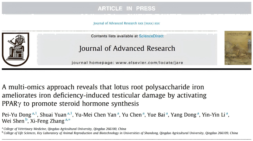 近日,williamhill中国张西锋教授课题组在国际顶级期刊《Journal of Advanced Research》杂志 (一区Top期刊,IF=11.4)上发表了题为“A multi-omics approach reveals that lotus root polysaccharide iron ameliorates iron deficiency-induced testicular damage by activating PPARγ to promote steroid hormone synthesis”的研究论文,探讨了莲藕多糖铁复合物(LRPF)对铁缺乏诱导睾丸损伤的改善作用及其潜在机制。