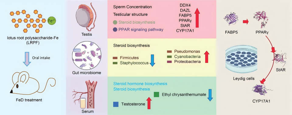 铁缺乏是影响雄性生殖健康的常见营养问题。 LRPF作为团队合成的一种新型铁补充剂,具有改善铁吸收、减少胃肠道反应、调节肠道微生物平衡和改善血液代谢水平等独特优点。LRPF能够有效为机体补充足够的铁,从而对抗机体铁缺乏状态并确保精子正常产生。不仅如此,LRPF可以改善整体健康状况。研究表明,肠道菌群通过发酵膳食纤维产生的短链脂肪酸(SCFAs)影响肠道以及类固醇激素在内的全身激素水平。PPAR作为重要的转录因子,调节与脂肪酸代谢相关的基因表达,对维持内分泌生殖器官的功能至关重要。