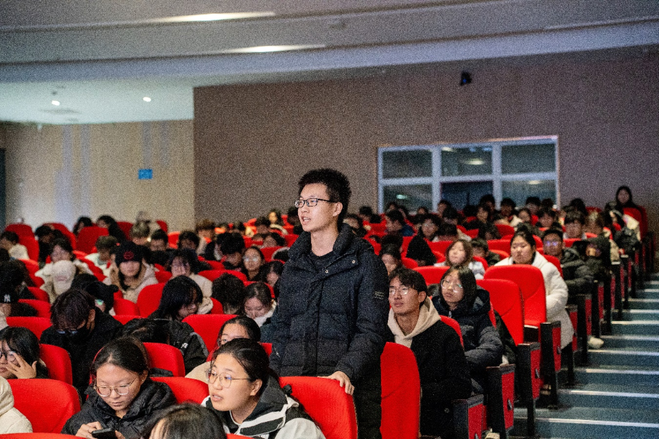 曹志以“青春为中国式现代化挺膺担当”为主题,结合个人指导比赛经历,详细介绍了中国国际大学生创新大赛与“挑战杯”中国大学生创业计划竞赛两项国家级竞赛的设置背景、参赛意义等相关内容,图文并茂地为同学们进行介绍,并与现场同学共同探讨新时代大学生如何在科研创新中践行社会责任,为实现中国式现代化贡献力量,引发现场同学强烈共鸣。