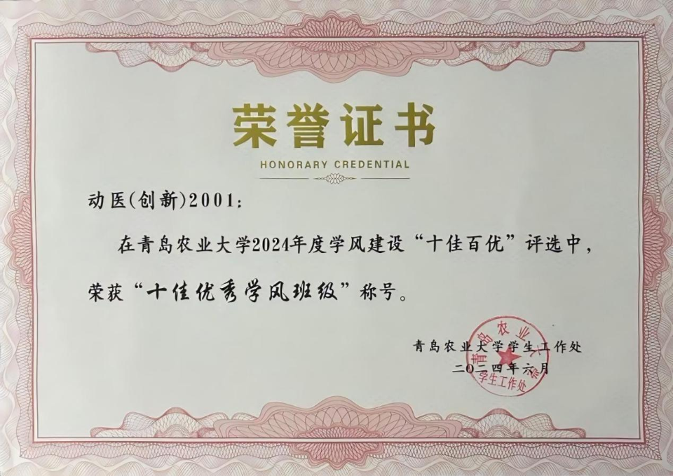 学院始终将立德树人作为根本任务,坚持党建领航,筑牢信仰根基。通过系统化的思想引领工程和浓厚的党建氛围熏陶,积极引导学生心怀“国之大者”,深刻理解并自觉践行“兽医报国”的时代使命。在学院精心培育和扎实的基层组织建设推动下,该班发展党员4名,1人曾任学院学生会主席团成员,1人曾任国护队队长。在持续强化的班风学风建设中,连续三年荣获“优秀班集体”称号,展现出卓越的精神风貌与凝聚力。