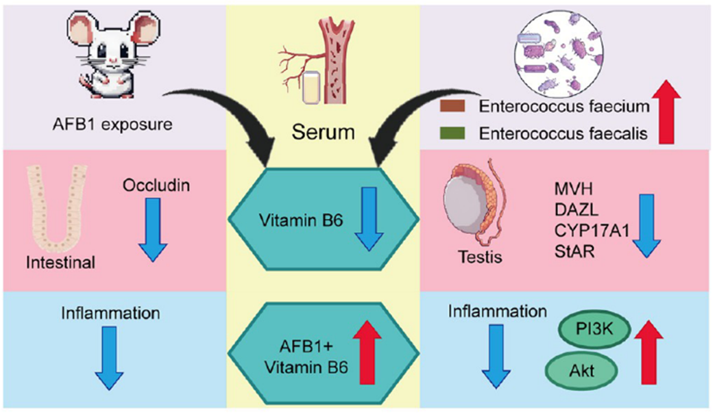 AFB1是一种有害的环境污染物,已知会破坏肠道微生物群并导致健康问题。近年来,VB6在维持肠道和生殖健康中的作用引起人们的广泛关注。已经发现AFB1通过破坏肠道微生物群,特别是通过增加肠球菌的丰度,破坏肠道屏障并引起炎症,但其深度作用机制尚不清楚。为了探究这个问题,张西锋课题组以小鼠为模型,对AFB1、肠球菌和VB6的作用机制进行了多组学分析。研究发现,AFB1暴露后的小鼠出现血清代谢物紊乱,血清VB6水平降低,睾丸炎症加重等症状。小鼠接触肠球菌可导致血清VB6水平降低,并伴有肠道和睾丸损伤。然而,补充VB6可显著改善AFB1诱导的肠道和睾丸损伤。转录组学和蛋白杂交结果显示,AFB1暴露后,VB6可增加小鼠睾丸中PI3K和AKT的表达及其磷酸化形式。根据研究结果,AFB1通过扰乱肠道微生物群导致肠道和睾丸损伤,而VB6代表了一种潜在的治疗方法来抵消这种损伤。综上所述,补充足够的VB6可以改善AFB1诱导的肠道和睾丸损伤,强调了VB6干预的重要性,为AFB1相关健康问题的预防和治疗提供了新的视角。