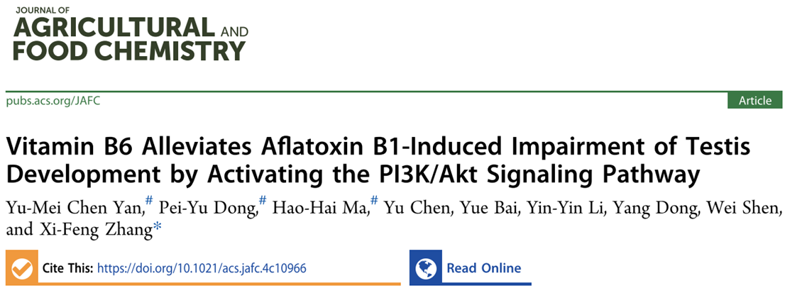 近日,williamhill中国张西锋教授课题组在国际顶级期刊《Journal of Agricultural and Food Chemistry》(一区Top期刊,IF=6.1)上发表研究性论文“Vitamin B6 Alleviates Aflatoxin B1-Induced Impairment of Testis Development by Activating the PI3K/Akt Signaling Pathway”,该论文从肠-睾丸轴的角度出发,深入探究了维生素B6(VB6)对黄曲霉毒素B1(AFB1)诱导的生精障碍的挽救机制。
