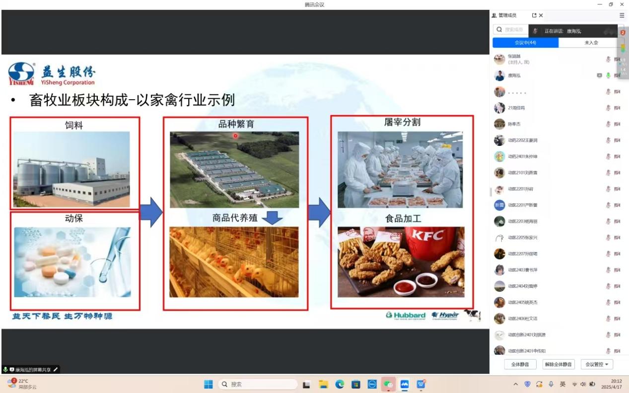 讲座中,康海泓博士深入浅出地介绍了家禽行业的产业链。从家禽的养殖、饲料供应,到屠宰加工、冷链物流,再到最终的市场销售,他详细阐述了产业链的各个环节及其相互关联。康海泓博士指出,家禽行业的发展离不开各环节的紧密配合,任何一个环节出现问题都可能影响整个产业链的正常运转。他通过一系列数据和案例,展示了家禽行业在规模扩张、技术创新、市场拓展等方面的显著成就。同时,康海泓博士也提醒同学们,行业的发展也面临着诸多挑战。未来,家禽行业的发展将更加注重可持续性,需要在保障食品安全、提升产品质量、加强品牌建设等方面下功夫,以满足消费者日益多样化的需求。