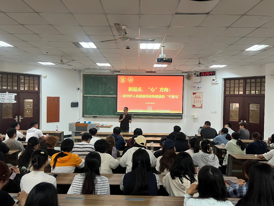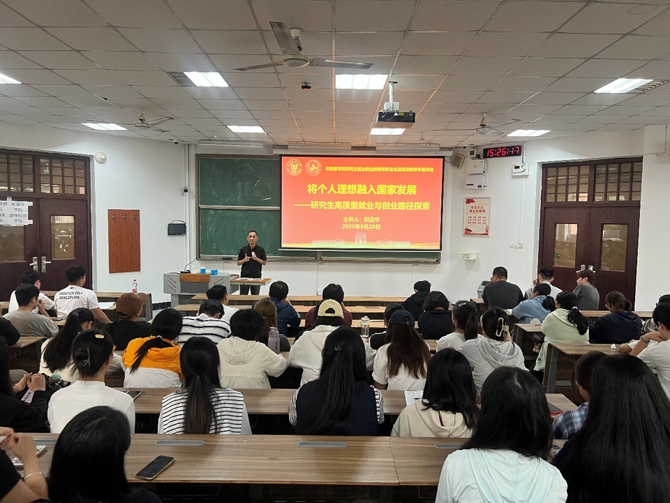 在职业发展与思想引领环节,团委书记和法华先后开展两场专题讲座。第一场围绕“将个人理想融入国家发展——研究生高质量就业与创业路径探索”,分析当前畜牧兽医领域就业形势与行业发展需求,解读相关创新创业政策,引导新生结合国家在兽医公共卫生、生物医药等领域的战略需求规划职业方向,寻找个人价值与国家发展的结合点。第二场以“新起点,‘心’方向:做守护人类健康和动物健康的‘千里马’”为主题,鼓励新生树立行业责任感,明确研究生阶段学习目标,在专业领域深耕细作,成长为兼具专业能力与使命担当的行业人才。