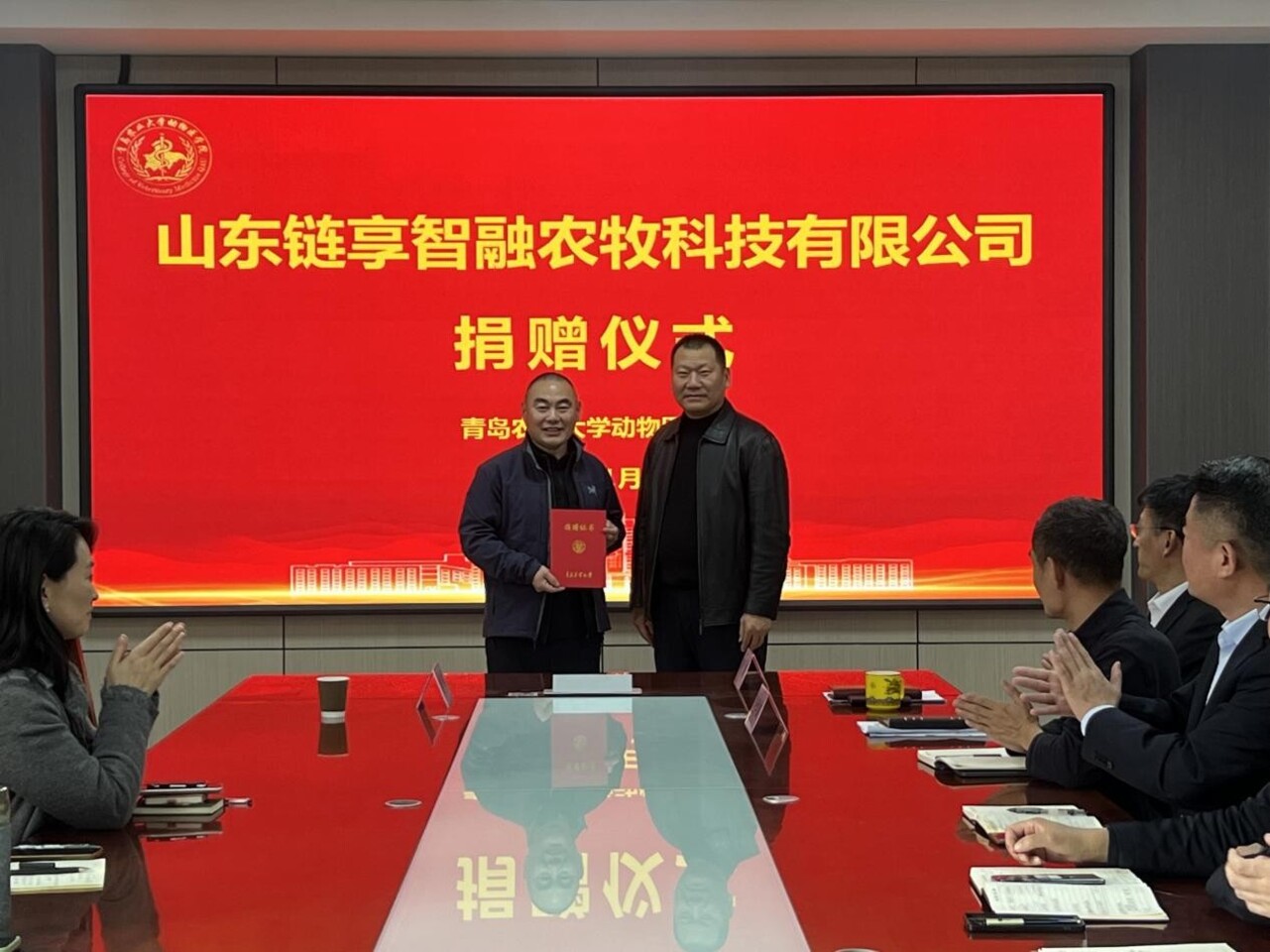 11月13日下午,山东链享智融农牧科技有限公司捐赠仪式在williamhill中国会议室举行。
