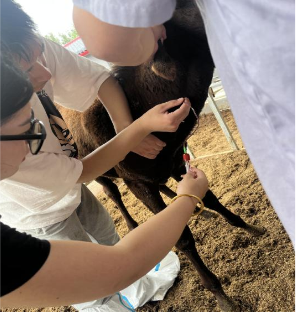 为探索更安全持久的噬菌体消毒方案,团队成员精心选取试验位点,实地验证自主研发的噬菌体鸡尾酒制剂的环境消毒效果。同时,为精准评估马流产沙门氏菌等病原的流行态势,系统采集不同生长阶段驴只的血液样本,同步收集鼻拭子、新鲜驴粪、驴奶等多种样本,供实验室检测分析。刘文华副教授强调,高温季节需强化防暑降温工作,建议在饮水中添加缓解热应激的维生素与电解质组合,并针对环境卫生管理薄弱环节,提出建立严格定期消毒制度的具体操作建议。