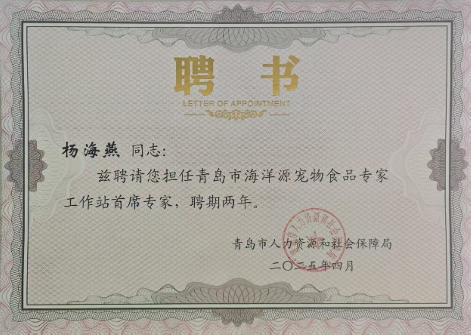 该工作站聚焦“同一个健康”理念,通过加强人兽共患病防控研究、推进宠物食品安全与营养健康技术开发,强化动物健康与人类健康、环境健康的协同保障机制,聚焦“海洋生物资源→宠物功能食品”全链条创新体系构建,核心任务在于深度挖掘海洋生物资源潜力,研发高品质海洋源宠物功能性食品,推动其在宠物健康领域的产业化应用。此举标志着杨海燕所在宠物疾病防治团队在推动海洋生物资源高值化利用、服务地方经济发展及践行海洋强国战略方面,开辟了宠物健康食品领域的创新高地。