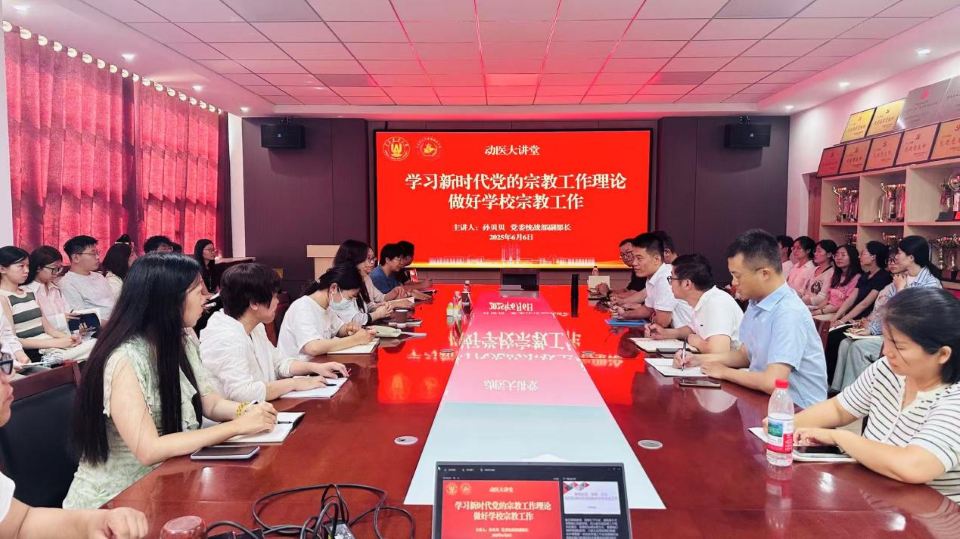 为深入贯彻落实党的二十大关于宗教工作的重要部署,持续强化高校宗教工作规范化、科学化建设,6月6日,williamhill中国动医大讲堂邀请校党委统战部副部长孙贝贝作《学习新时代党的宗教工作理论做好学校宗教工作》专题辅导报告。此次报告会由学院党委书记丁国庆主持,学院领导班子成员、各党支部书记及委员、师生党员代表共50余人聆听报告。
