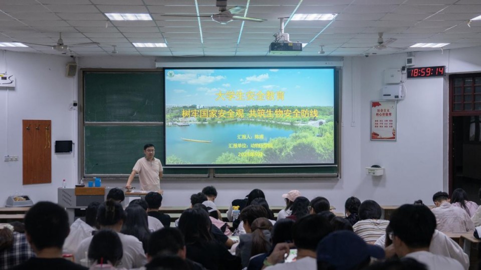 陈甫教授以“国之大者”为切入点,从历史维度梳理国内外重大生物安全事件——从过往的重大疫病流行,到近年来全球公共卫生挑战,结合我国在生物安全防控中的实践案例,阐明生物安全不仅是公共卫生问题,更是关系国家主权、经济发展、社会稳定的“国家安全基石”。他通过讲述当非洲猪瘟疫情冲击我国畜牧产业时,无数兽医工作者冲锋在前;当新冠疫情防控需要时,动物医学领域的科研力量主动参与病原溯源与检测技术研发等鲜活的行业故事,让学生深刻体会到生物安全防线的构建,离不开一代又一代从业者的责任担当,而这份担当,正是“为国护安”的具体体现。
